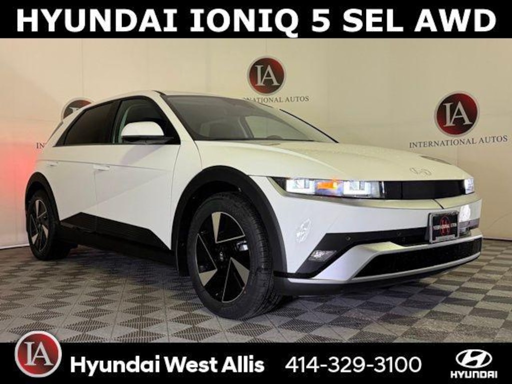 IONIQ 5 SEL AWD, 4D Sport Utility, Electric Motor, 1-Speed Automatic, AWD, Atlas White, Black w/H-Tex Artificial Leather Seating Surfaces, 4-Wheel Disc Brakes, 6 Speakers, ABS brakes, Air Conditioning, All Season Fitted Liners, Alloy wheels, AM/FM radio: SiriusXM, Apple CarPlay & Android Auto, Auto High-beam Headlights, Auto-dimming Rear-View mirror, Automatic temperature control, Bodyside moldings, Brake assist, Bumpers: body-color, Cargo Net, Carpeted Floor Mats, Delay-off headlights, Driver door bin, Driver vanity mirror, Dual front impact airbags, Dual front side impact airbags, Electronic Stability Control, Emergency communication system: None, First Aid Kit, Four wheel independent suspension, Front anti-roll bar, Front Bucket Seats, Front Center Armrest w/Storage, Front dual zone A/C, Front reading lights, Fully automatic headlights, Garage door transmitter: HomeLink, H-Tex Artificial Leather Seating Surfaces, harman/kardon® Speakers, Heated door mirrors, Heated Front Bucket Seats, Heated front seats, Illuminated entry, Low tire pressure warning, Mudguards, Navigation System, Occupant sensing airbag, Option Group 01, Outside temperature display, Overhead airbag, Overhead console, Panic alarm, Passenger door bin, Passenger vanity mirror, Power door mirrors, Power driver seat, Power Liftgate, Power passenger seat, Power steering, Power windows, Radio: AM/FM/SiriusXM/HD Audio System, Rear anti-roll bar, Rear reading lights, Rear seat center armrest, Rear side impact airbag, Rear window defroster, Rear window wiper, Remote keyless entry, Security system, Speed control, Speed-sensing steering, Split folding rear seat, Spoiler, Steering wheel mounted audio controls, Telescoping steering wheel, Tilt steering wheel, Traction control, Trip computer, Turn signal indicator mirrors, Up Seatback Cargo Mat, Variably intermittent wipers, Wheels: 19" x 7.5J Alloy, IONIQ 5 SEL AWD, 4D Sport Utility, Electric Motor, 1-Speed Automatic, AWD, Atlas White, Black w/H-Tex Artificial Leather Seating Surfaces.